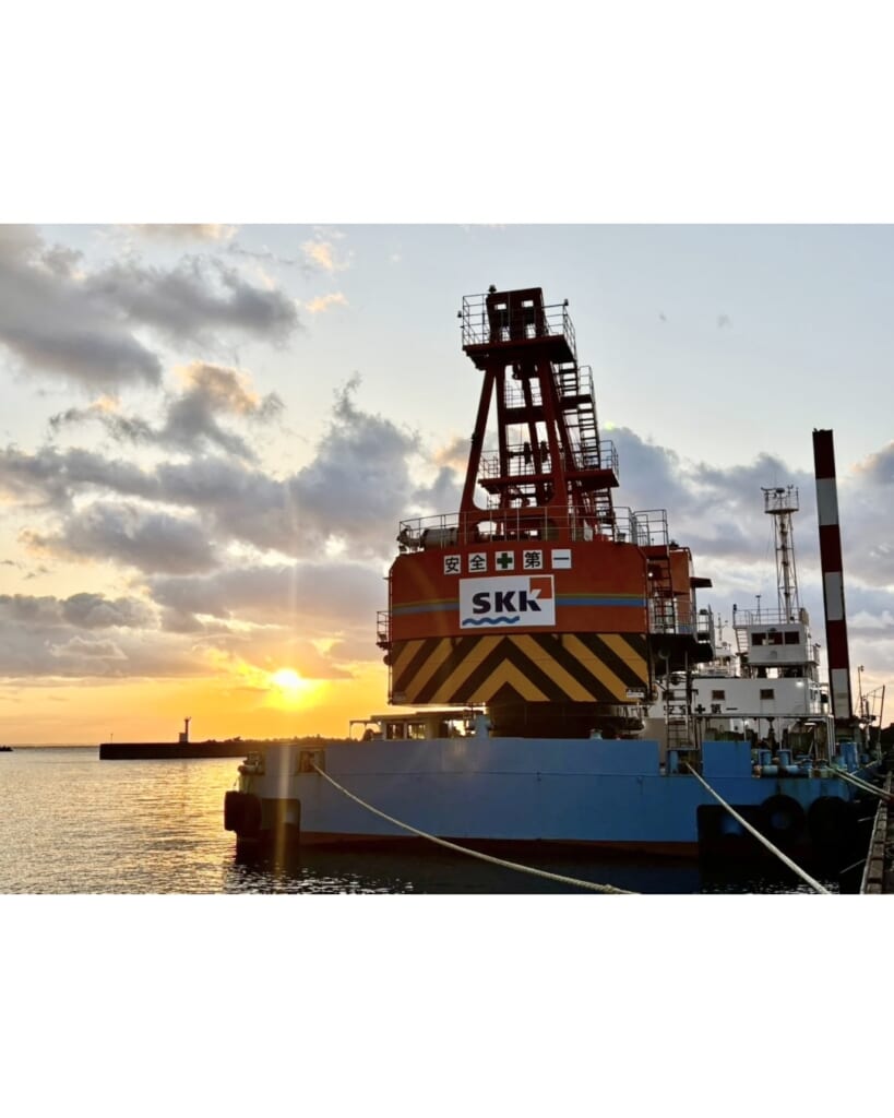今回の写真は、弊社の起重機船「第21中田号」を利尻の鬼脇港で撮影した1枚。